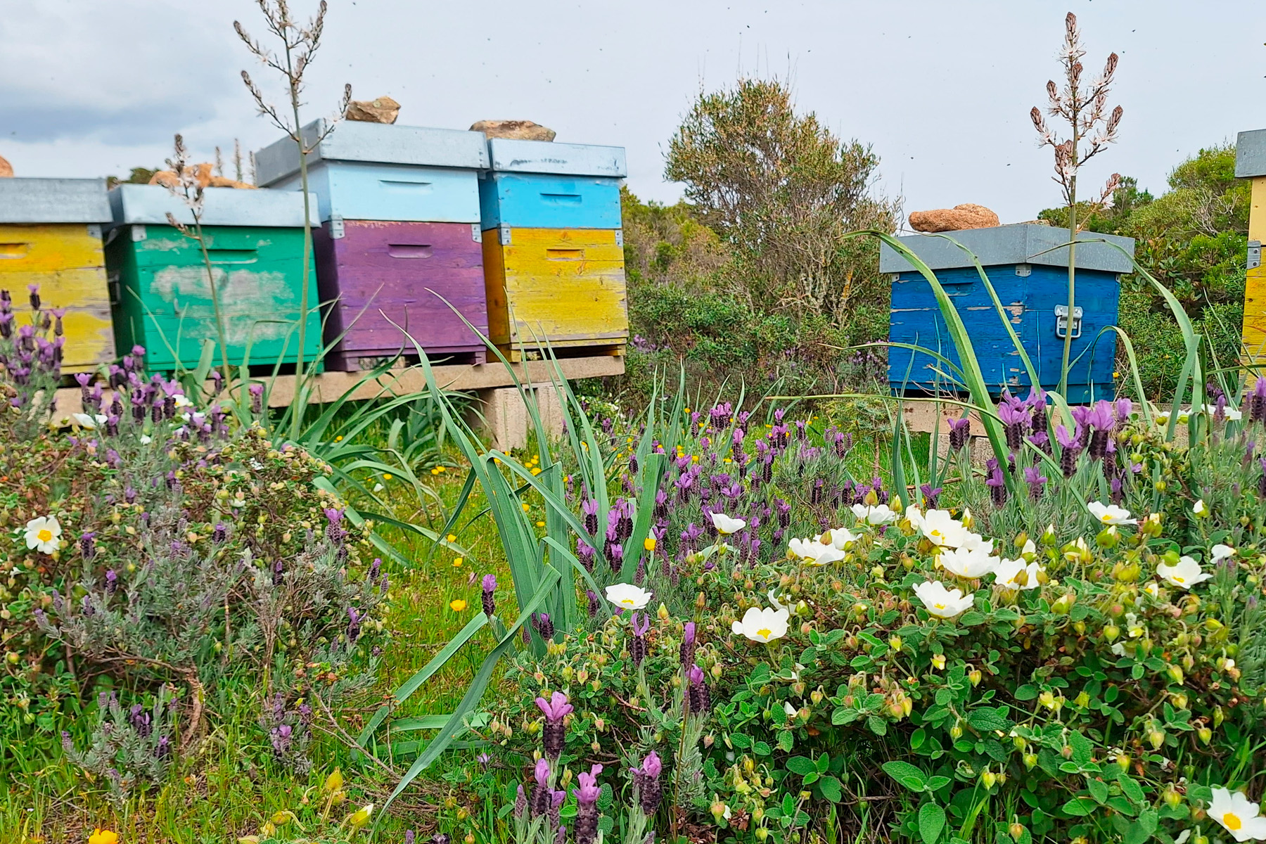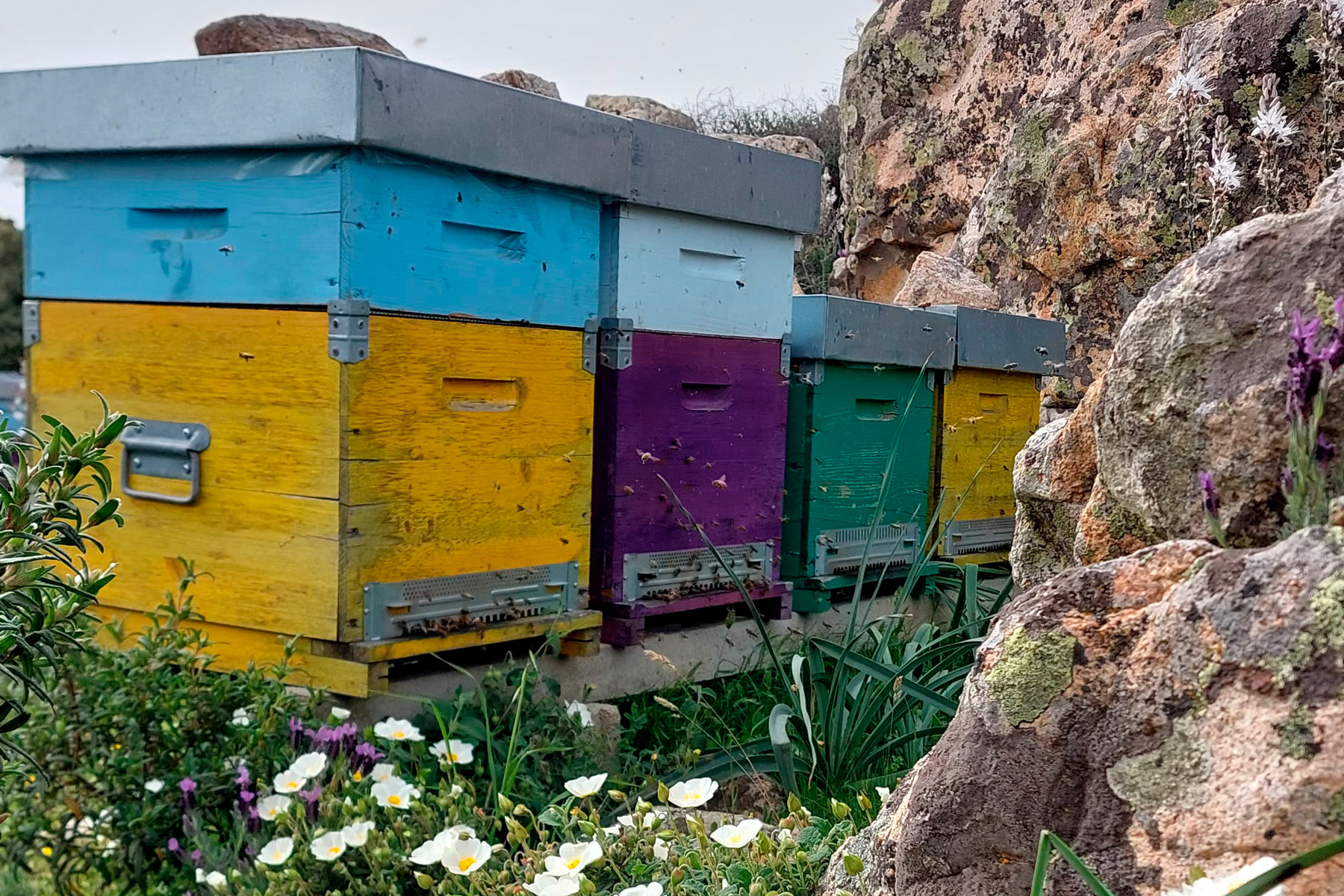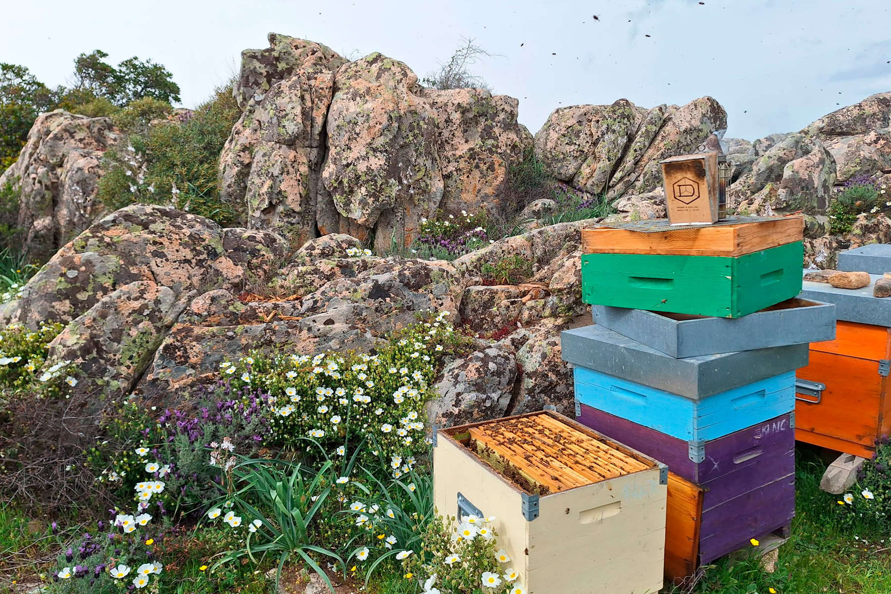 Oggi i nostri alveari si trovano nelle campagne della Gallura, tra macchia mediterranea, rocce granitiche e fioriture spontanee. In questo ambiente ricco e incontaminato, le api raccolgono nettari diversi durante le stagioni, dando vita a mieli naturali dal carattere unico, profondamente legati alla terra da cui provengono.
