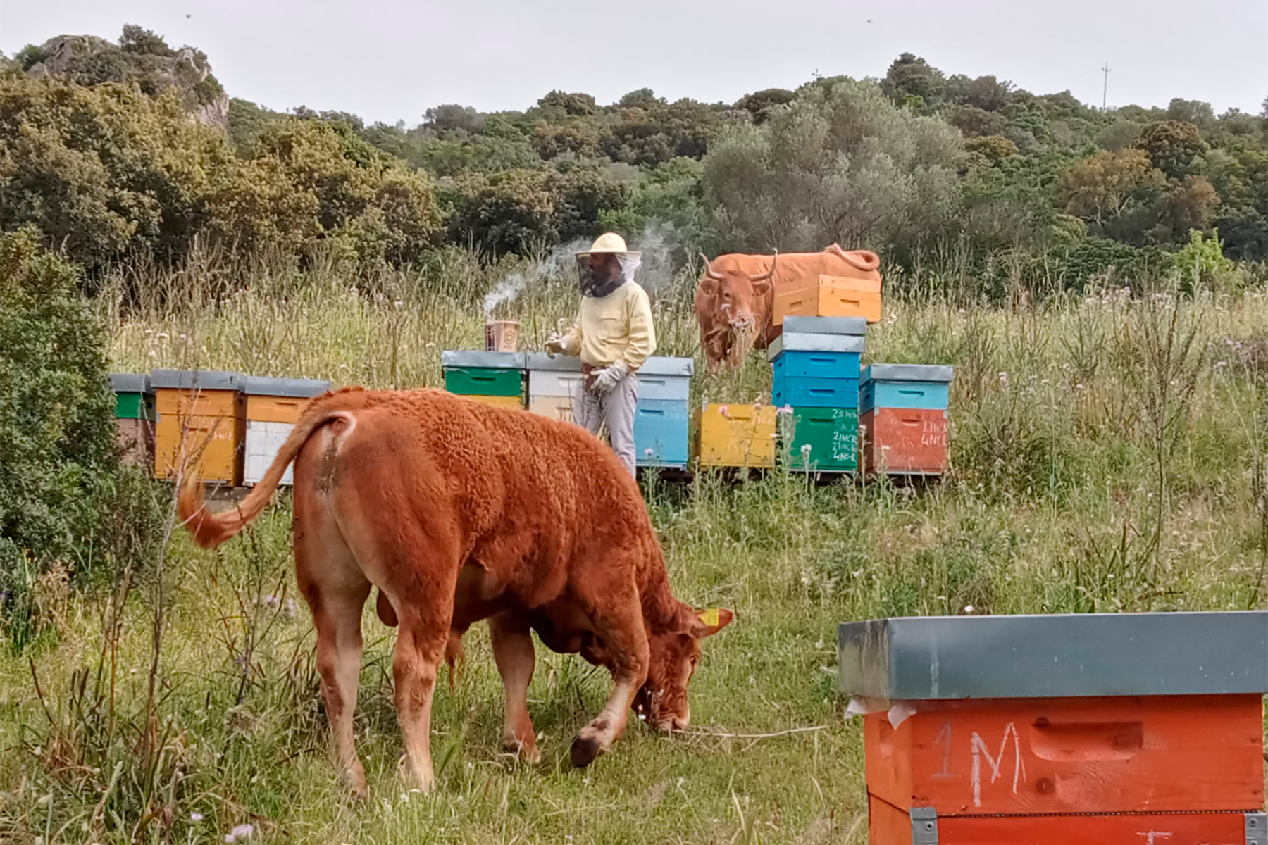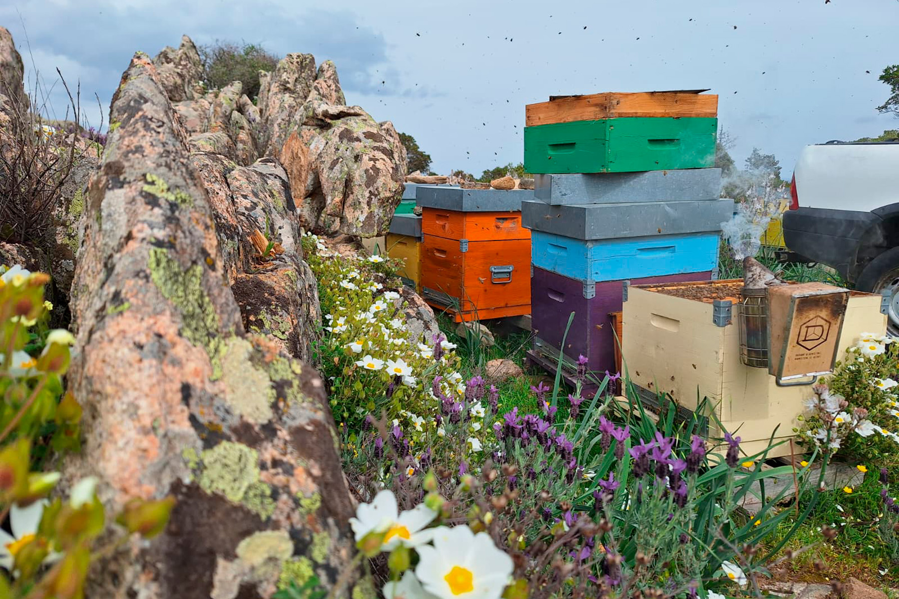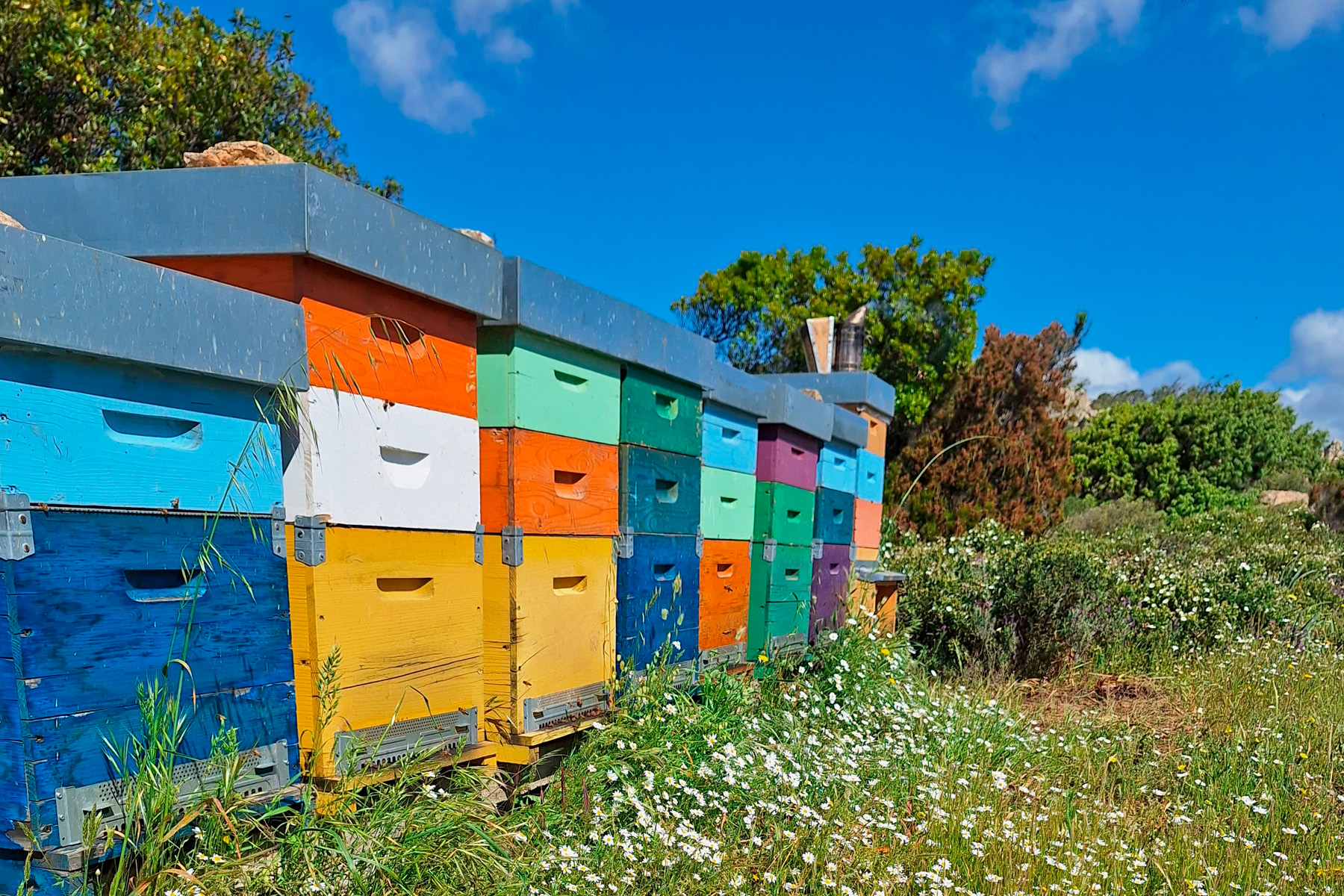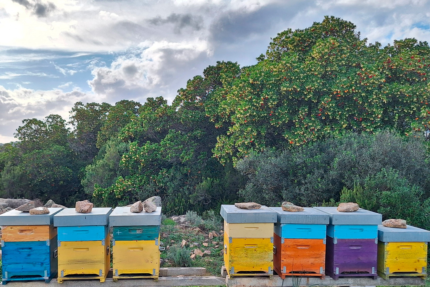 Oggi i nostri alveari si trovano nelle campagne della Gallura, tra macchia mediterranea, rocce granitiche e fioriture spontanee. In questo ambiente ricco e incontaminato, le api raccolgono nettari diversi durante le stagioni, dando vita a mieli naturali dal carattere unico, profondamente legati alla terra da cui provengono.